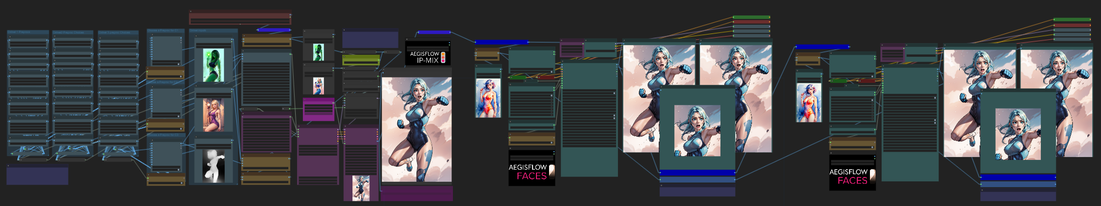 AegisFlow is a project-oriented workflow designed for those needing to auto-generate assets for various concepts in a system that handles project/file naming automatically and keeps ideas organizable. It is sectionally arranged, and many sections can be muted while searching for just the right seed/conditioning/settings.