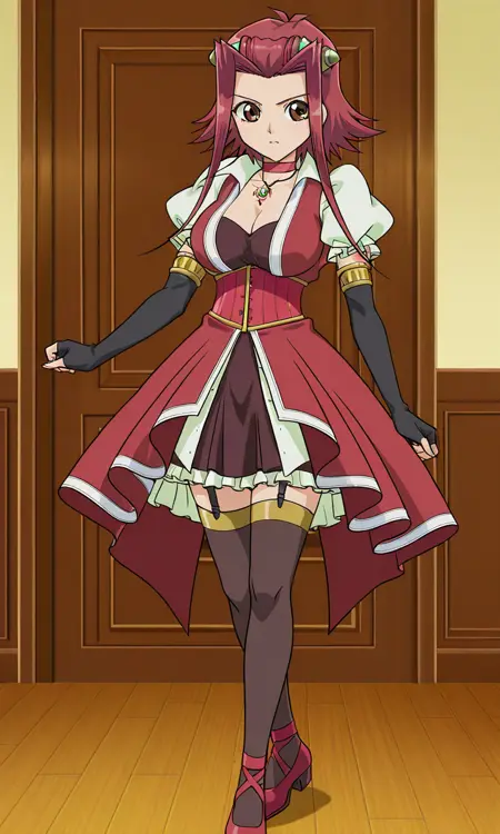 Aki Izayoi, 1girl, solo, red hair, brown eyes, short hair with long locks, hair ornament,large breasts, aki-casual, red sleeveless jacket, collar, thighhighs, cleavage, puffy sleeves, pendant, corset, garter straps, zettai ryouiki, red shoes, elbow gloves, chocker, necklace,