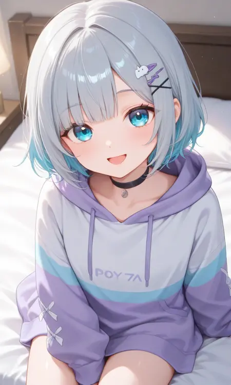 sumire cozy, x hair ornament, short hair, black choker, multicolored hoodie, hood down, purple hoodie, white hoodie🛏️1番目の衣装(パジャマ):