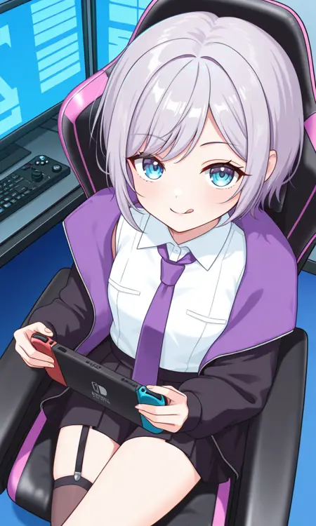 sumire un1form, short hair, swept bangs, white shirt, collared shirt, sleeveless shirt, purple necktie, black jacket, open jacket, black skirt, single thighhigh, gater strap- 旧髪型: