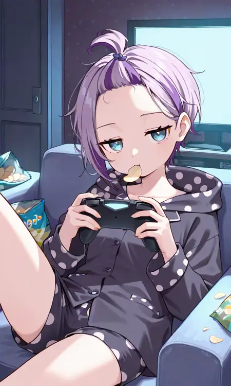 sumire pajama, short hair, forehead, hair slicked back, topknot, pajamas, hood, black shorts, polka-dot shorts👾旧2番目の衣装(制服):