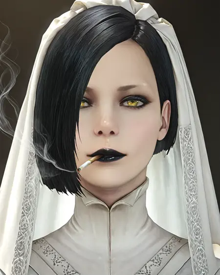 human form, black hair, woman, pale skin, short hair, bangs covering eyes, white coat, black eyeliner, black lips, yellow eyes, black high boots