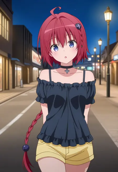 | 训练词汇 | ahoge, hair between eyes, side braid, braided ponytail, short hair, red hair, blue eyes, hair ornament, hair bobbles已复制! hood down, cropped shirt, sleeveless shirt, black shirt, clothing cutout, midriff, asymmetrical gloves, single detached sleeve, single glove, fingerless gloves, black belt, short shorts, black shorts, thigh strap, knee boots, black footwear已复制! school swimsuit, blue one-piece swimsuit已复制! yellow sweater vest, collared shirt, white shirt, green bowtie, short sleeves, miniskirt, pleated skirt, plaid skirt, green skirt已复制! black choker, off-shoulder shirt, frilled shirt, black shirt, bra strap, short sleeves, short shorts, yellow shorts已复制! |