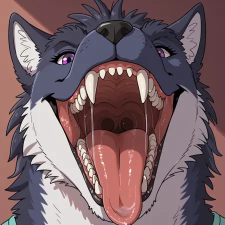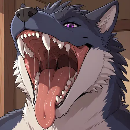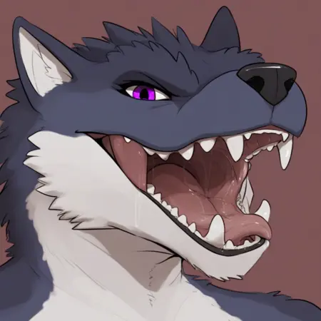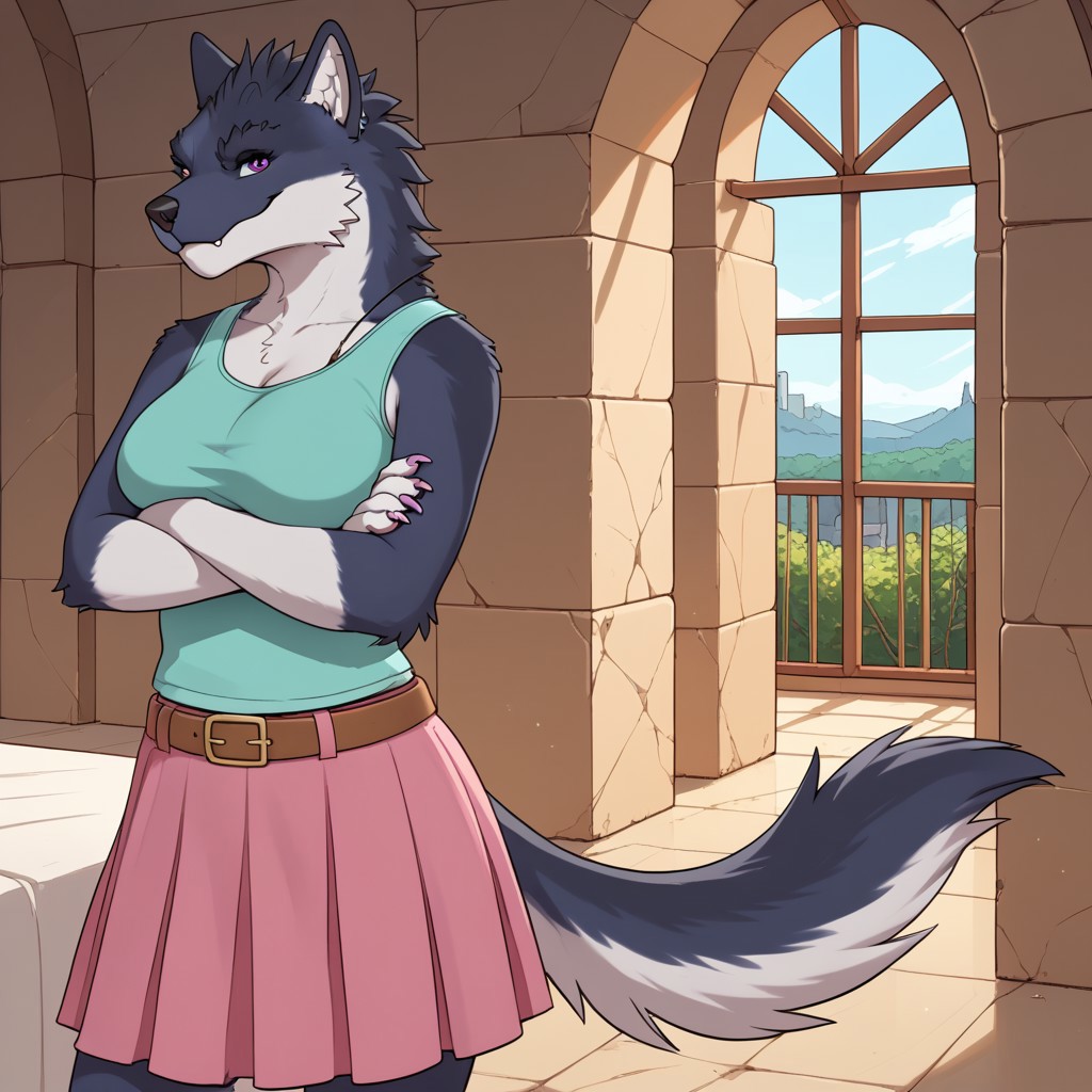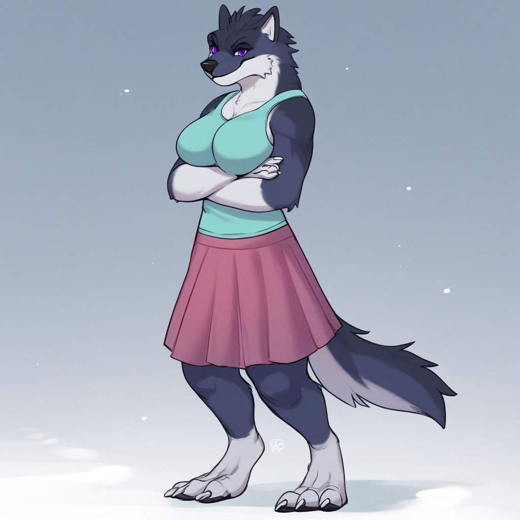 wolf, wolfgirl, black and white fur, purple eyes, wolf ears, black nose, wolf tail, claws, large breasts, three toe feet,