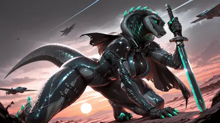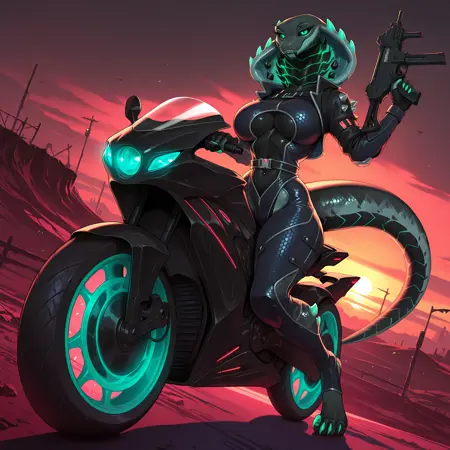 人間なし、densatra、1girl、コブラガール、緑の目、黒の虹彩、緑のトゲ付き蛇のフード、蛇のフードのピアス、黒い牙、眉のピアス、トゲ付きサイバーパンクスーツ、ベルト、緑の爪、緑のネイル、尾