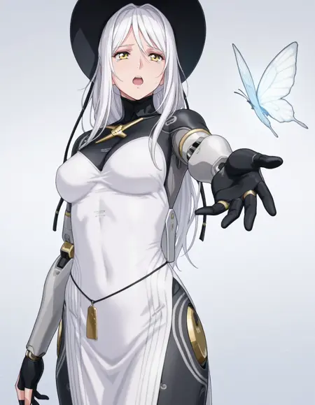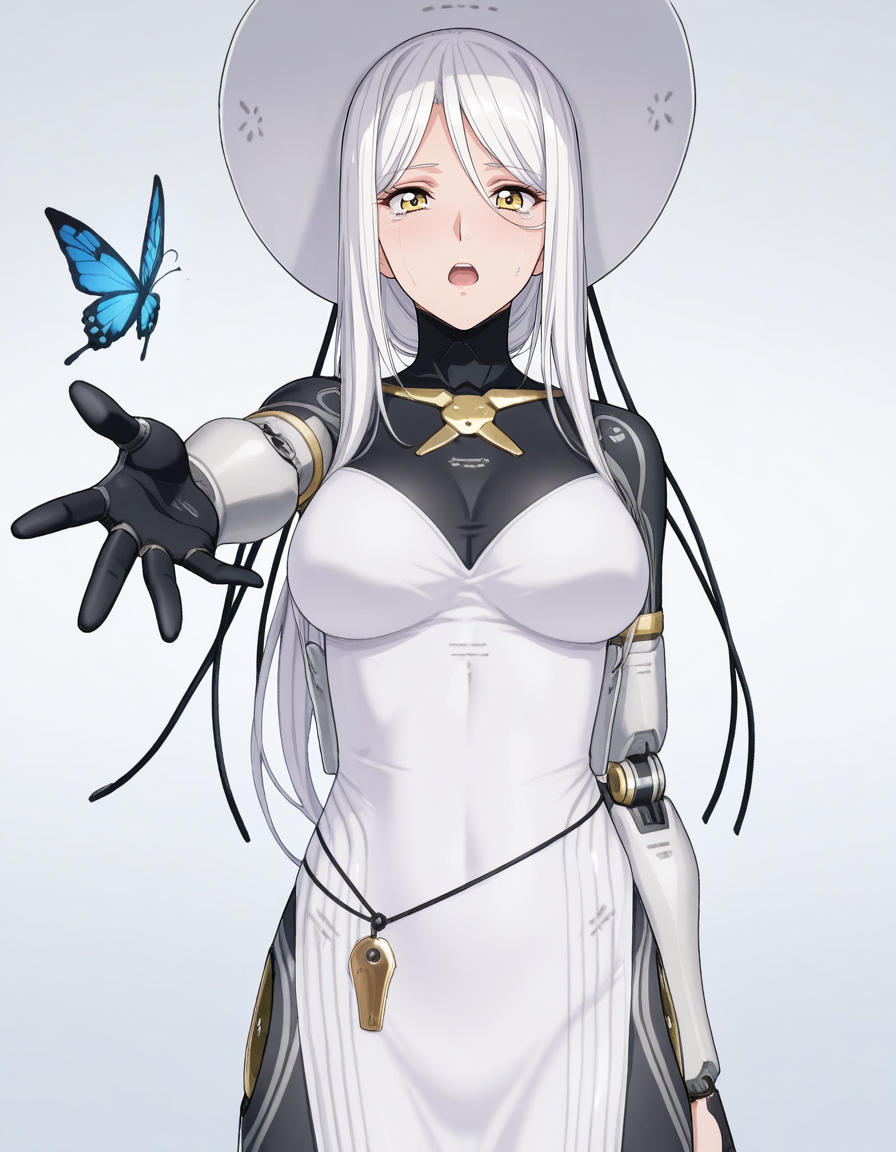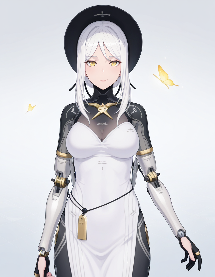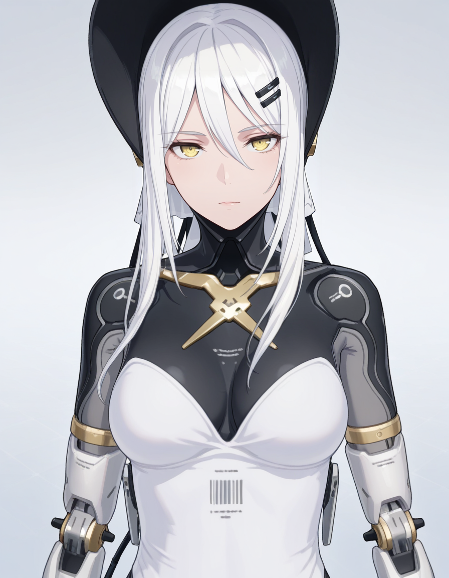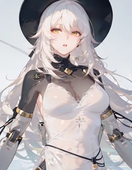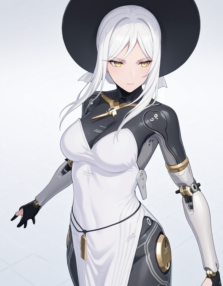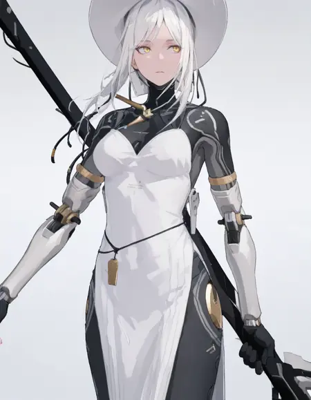 mai_pgr_hakama_yx,1girl,mature female,(aged up:1.5),white_hair,yellow eyes,hat,white_dress,mechanical_arms,mechanical_legs,robot_joints,holding_weapon,scythe
