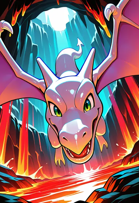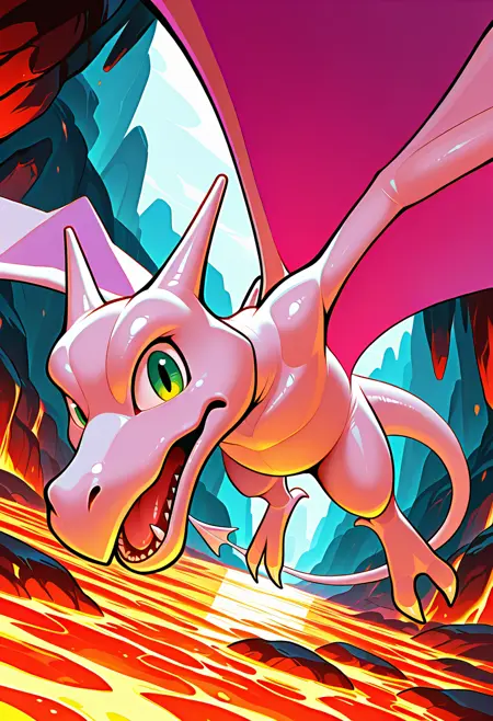 ポジティブプロンプト: pokemon, solo, open_mouth, teeth, green_eyes, fangs, dragon, no_humans