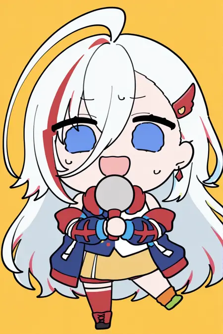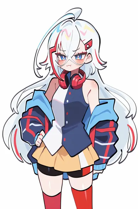 | 학습된 단어 | hououkarin, multicolored hair, long hair, white hair, streaked hair, red streaks, bangs, hair between eyes, headphones, headphones around neck, blue eyes, shirt, off shoulder, sleeveless, two-tone shirt, two-tone jacket, blue jacket, ahoge, yellow skirt, red wing hair ornament, shorts under skirt, long hair between eyes, long sleeves, asymmetrical legwear, uneven legwear, mismatched footwear, single thighhigh, single sock, red thighhighs, orange socks, green shoes, red shoes복사됨! |