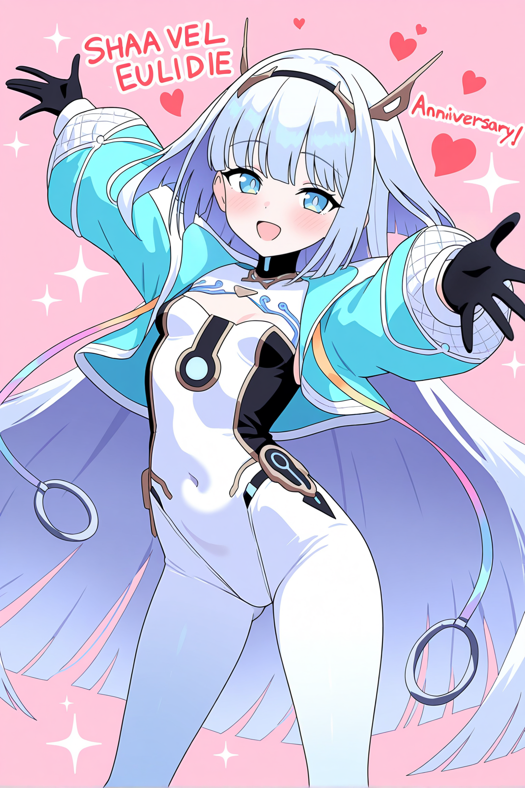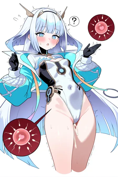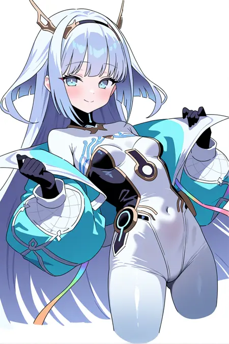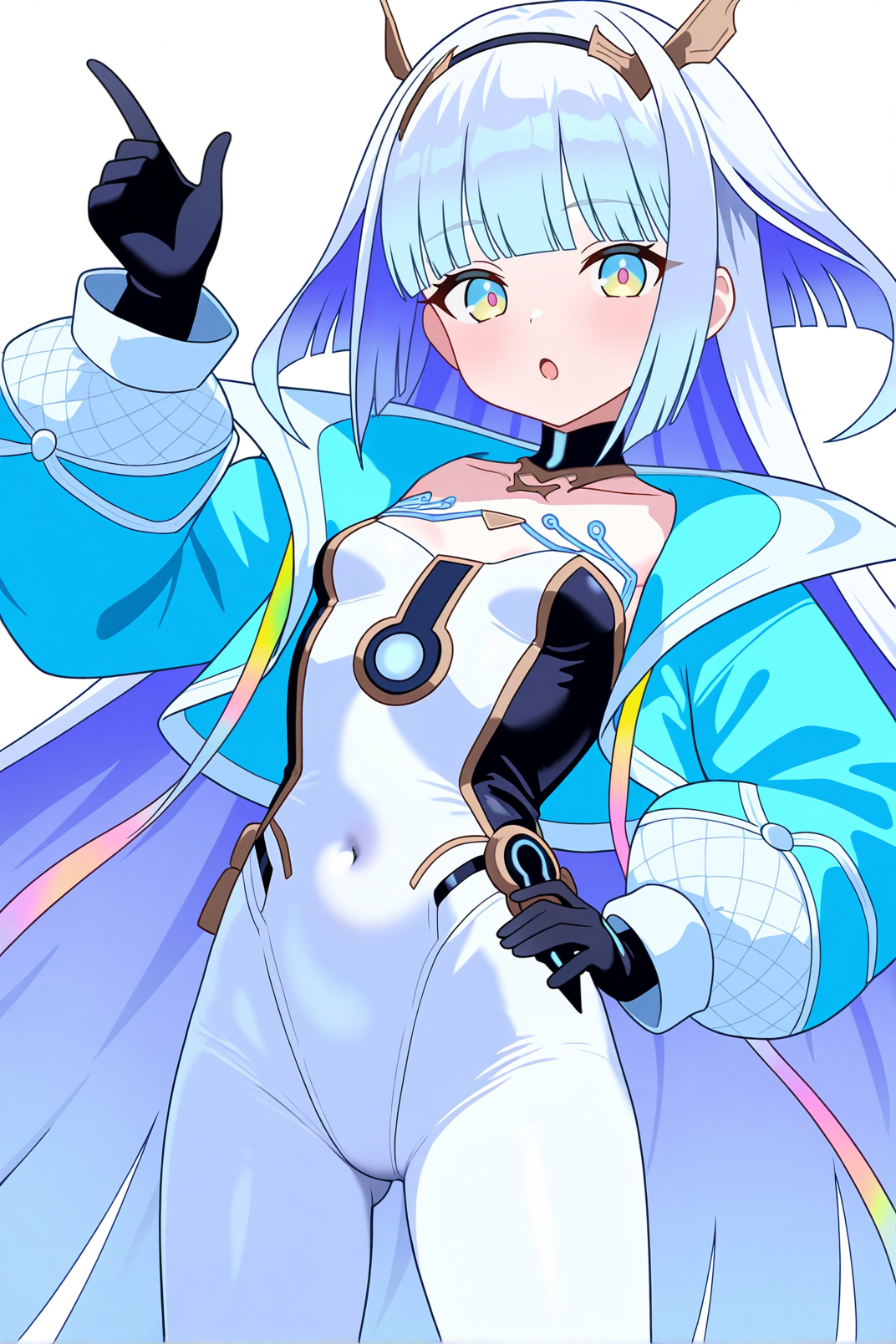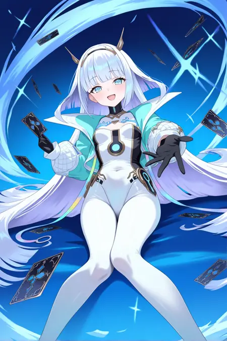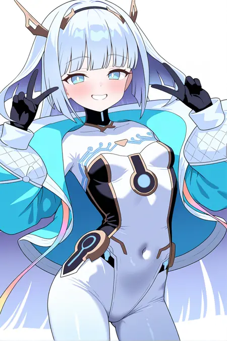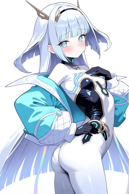 태그(옷): 금속 헤어 장식, 검은 장갑, 흰색 바디수트, 아쿠아 재킷