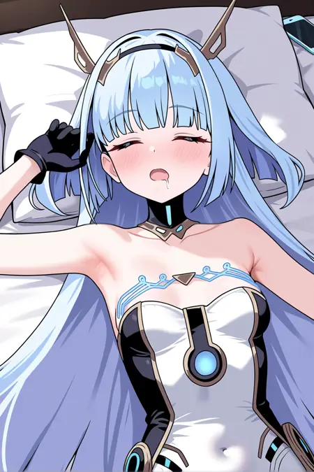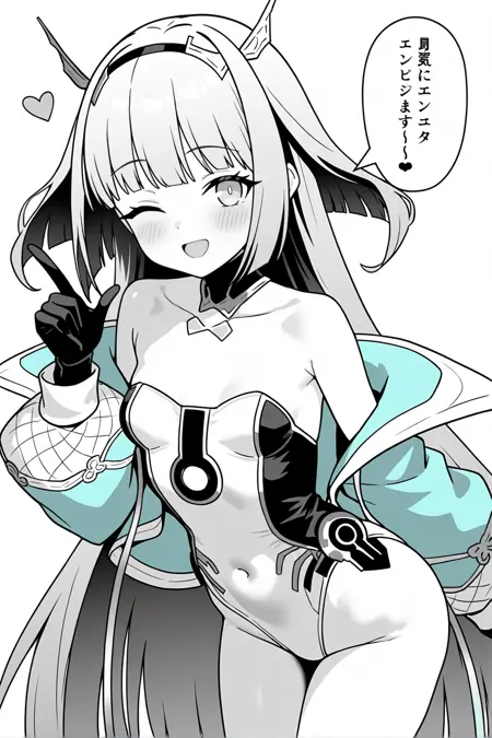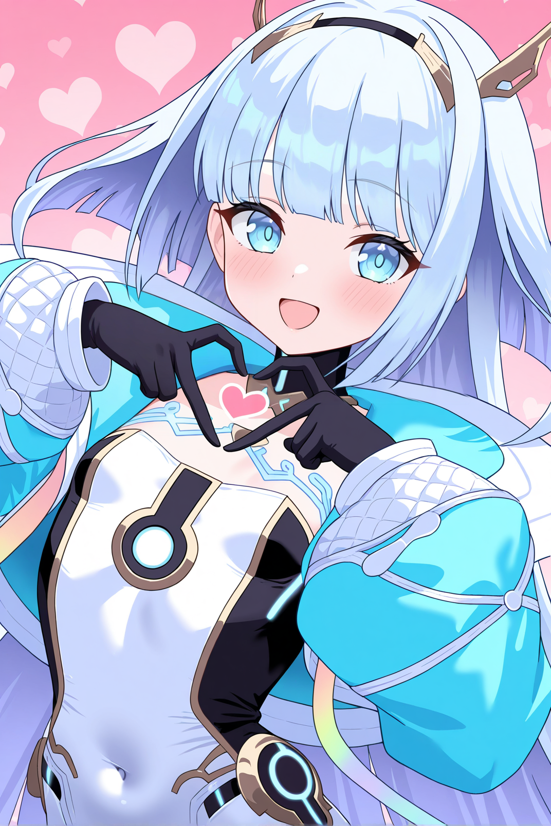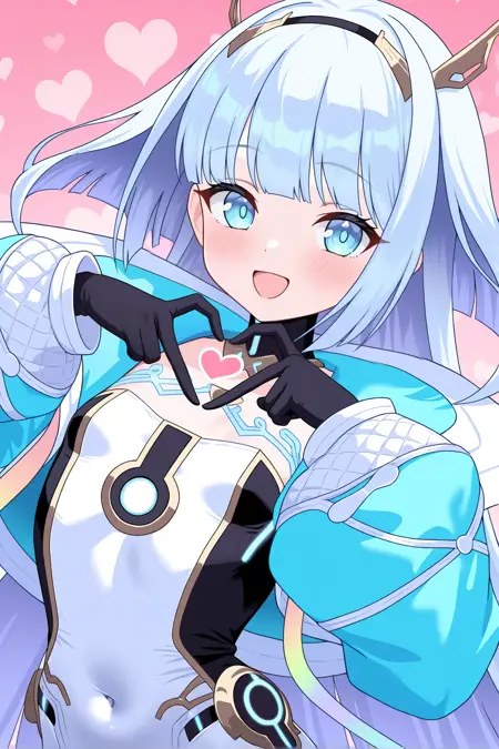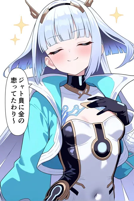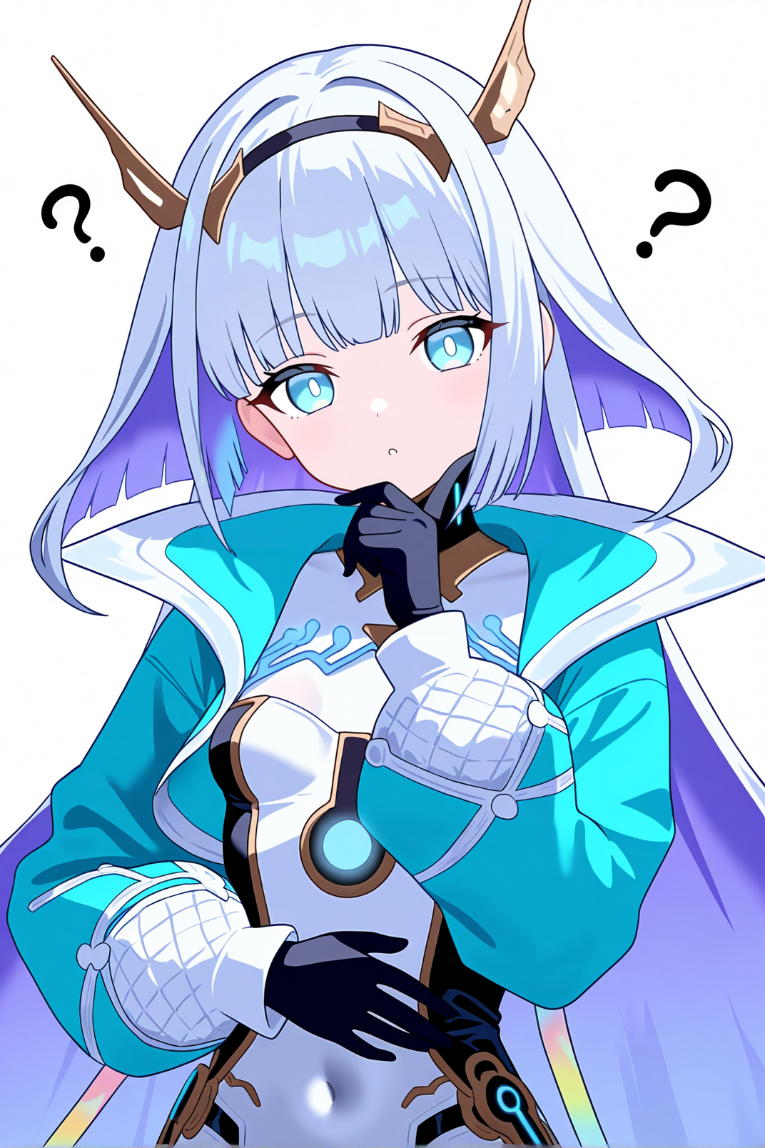 태그(옷): 금속 헤어 장식, 검은 장갑, 흰색 바디수트, 아쿠아 재킷