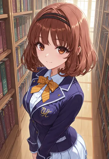 tags:sasaki_kaori, brown hair, short hair, brown eyes, hairband, unioutfit, bowtie, medium breasts,blazer,white pleated skirt,