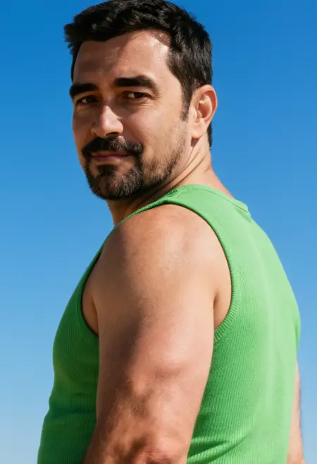 retro artstyle、ink wash painting、messy hair、thick mustache、full beard、mustache stubble、beard stubble和hair slicked back。