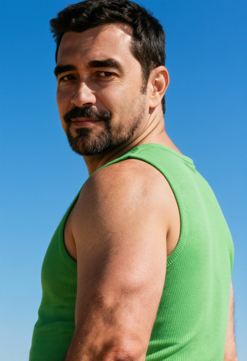 mustache and goatee를 사용하여 콧수염과 턱수염을 모두 연출하세요.bald를 사용하여 대머리 모양을 연출하세요.wet hair를 사용하여 머리카락이 젖거나 축축해 보이는 효과를 연출하세요.