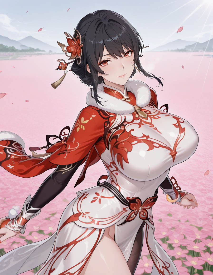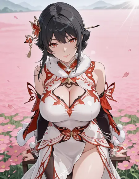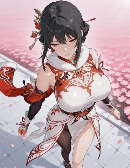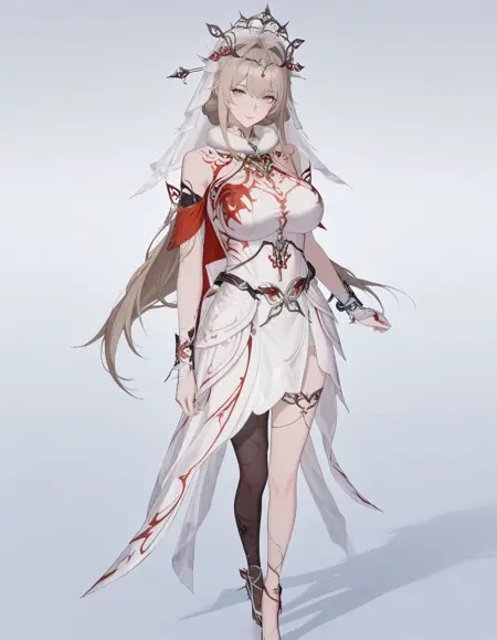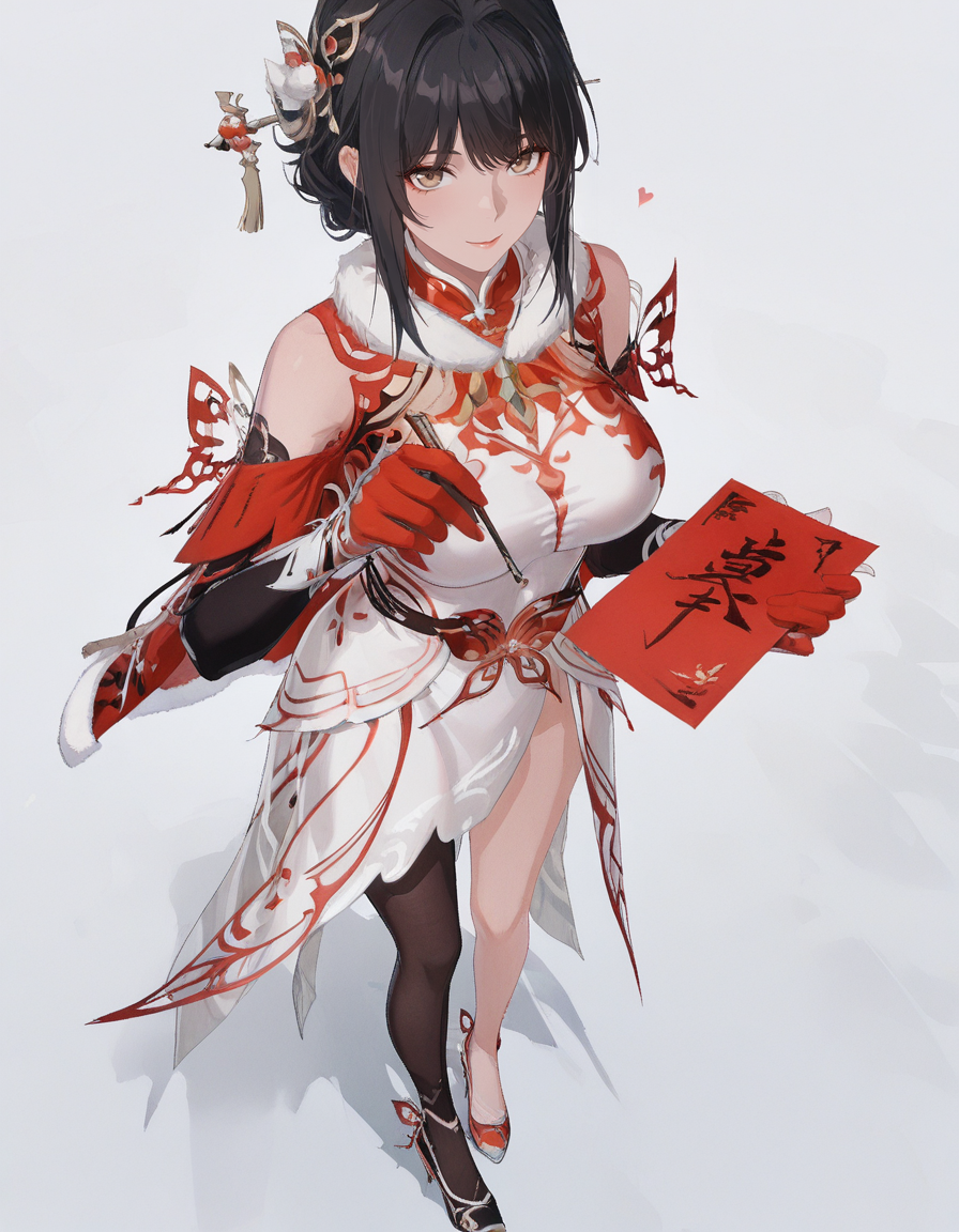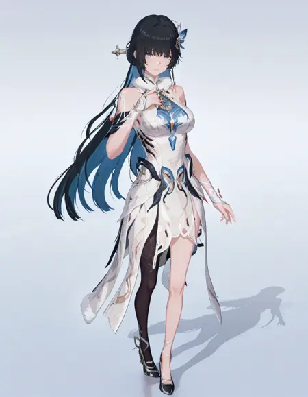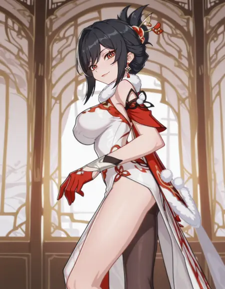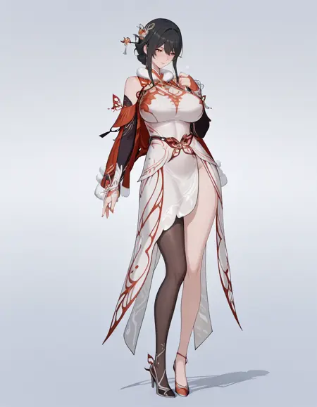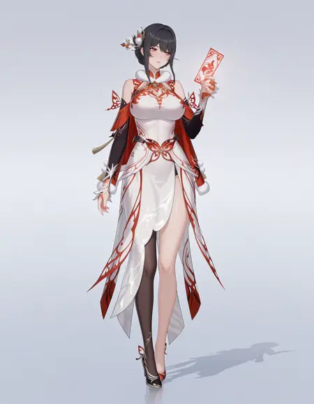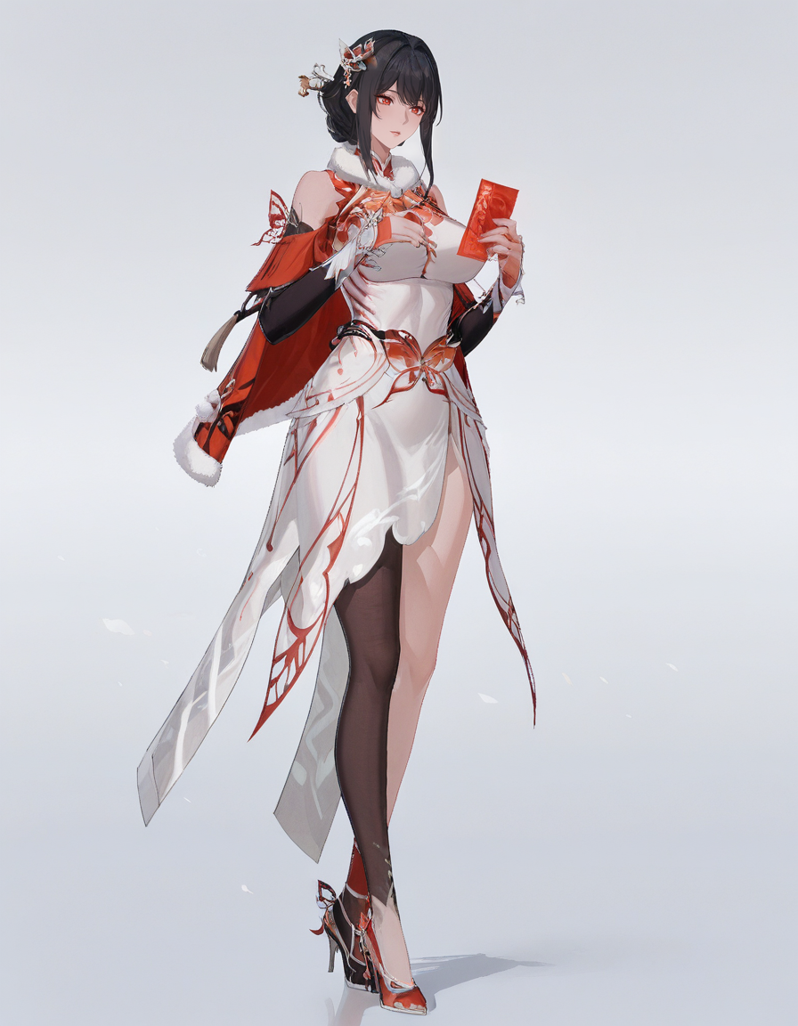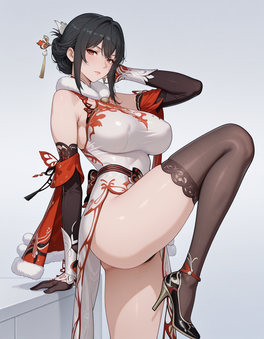 mai_pgr_hanying_tx_hyxc,1girl,(aget_up:1),white_dress,chinese_clothes,black_hair,hair_ornament,gloves,fur_trim,hair_stick,single_leg_pantyhose,large_breasts,asymmetrical_legwear,fur_collar,high_heels