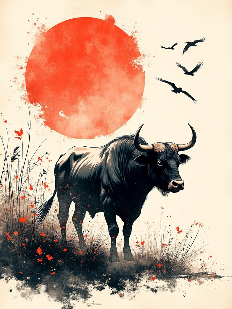 Chinese ink - wash style with zodiac animals. A ox standing calmly in a field, with some fallen leaves, a large, warm - colored sun in the background.