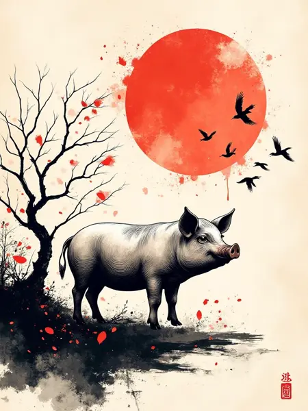 Chinese ink - wash style with zodiac animals. A pig standing sturdily under a tree, flying birds around, a vibrant red sun in the sky.