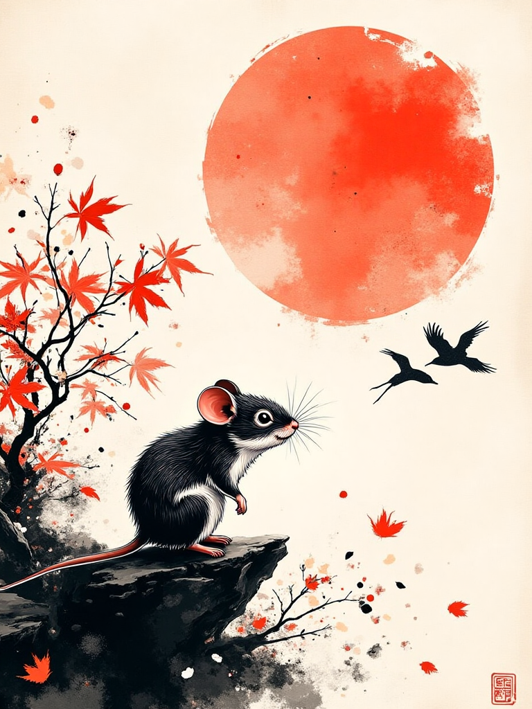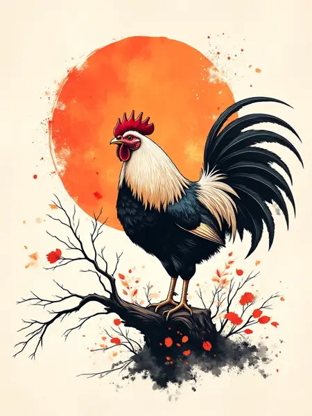 Chinese ink - wash style with zodiac animals. A rooster crowing on a bare branch, scattered autumn leaves, a glowing red sun overhead.