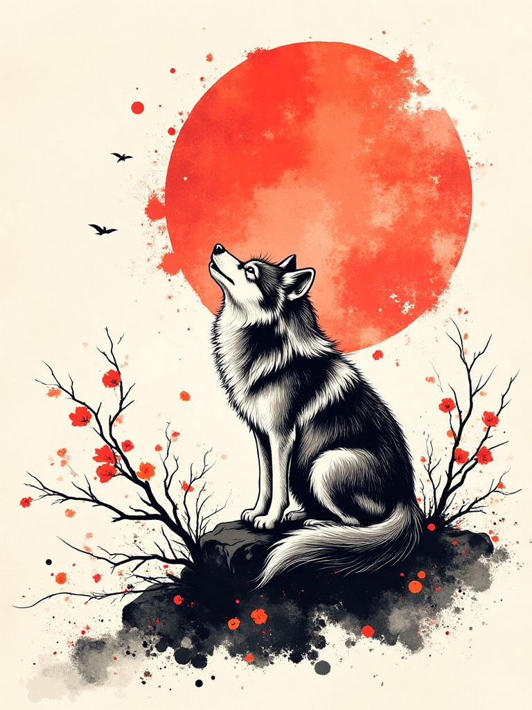 Chinese ink - wash style with zodiac animals. A goat standing on a rocky outcrop, with some sparse plants, a large red sun dominating the sky.