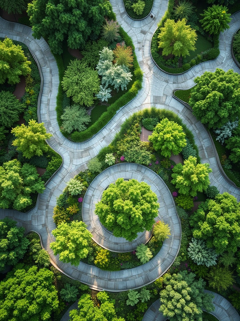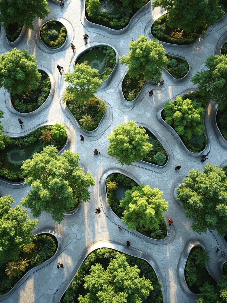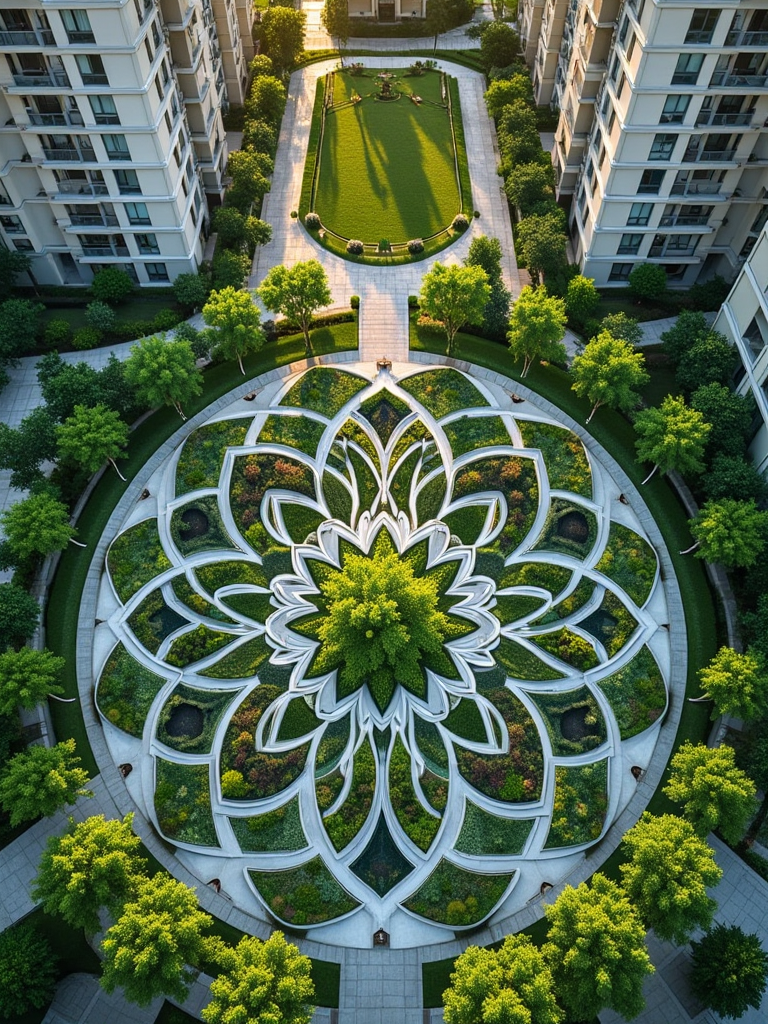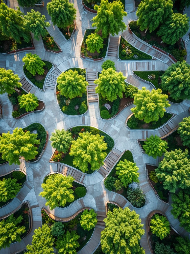 風景建築の空撮ビュー、モダンな住宅地、幾何学的な緑地、曲がりくねった小道、建築物と自然の調和した統合、日差しが柔らかな影を落とす。