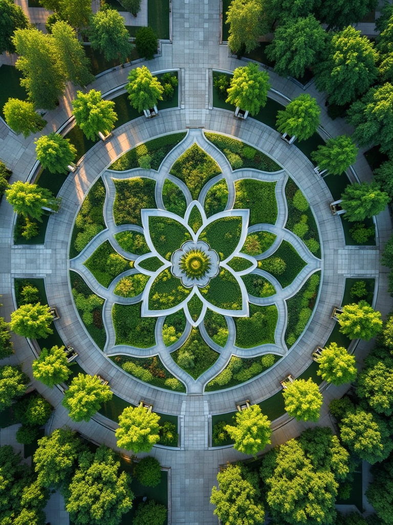 風景建築の空撮ビュー、都市公園、対称的な花壇、円形の広場、周囲を映す湖、豊かな木々がシーンを囲む。