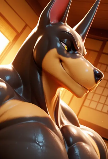 强化提示:“兽人,杜宾犬,尾巴,黄眼睛,纹身,背部纹身,肌肉发达,男子气概,成熟男性, bara,宽大胸肌”