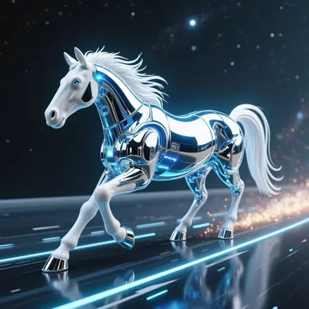5. Cyberpunk - style zodiac animals, horse galloping on a digital highway, metallic hooves sparking, with cybernetic implants all over its body.