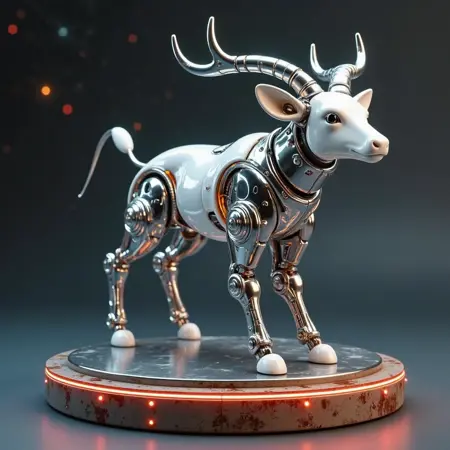3. Cyberpunk - style zodiac animals, ox with mechanical joints, standing on a rusty metal platform, red warning lights blinking around it.