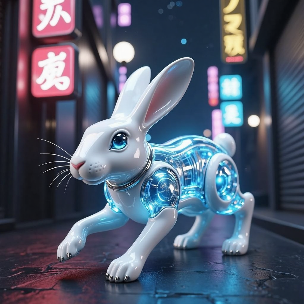 1. Cyberpunk - style zodiac animals, rabbit with neon circuits glowing, white body, in a dark alley filled with holographic signs, dynamic running pose.