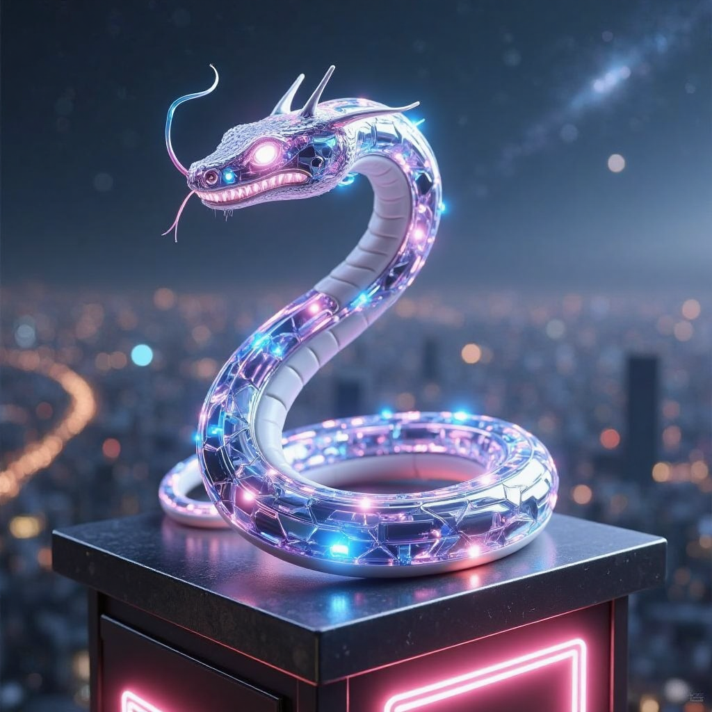 4. Cyberpunk - style zodiac animals, snake coiling on a neon - lit rooftop, its body made of glass and light, with a city in the background.