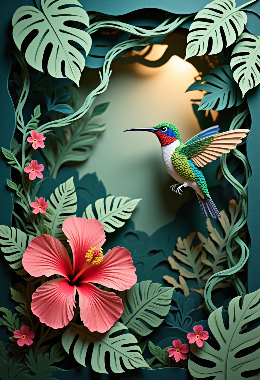 ジャングルをテーマにした紙切りスタイル、ヒスイカナヘビの花の群れの近くで飛び立つハチドリ、枝にはツタが絡まっている。