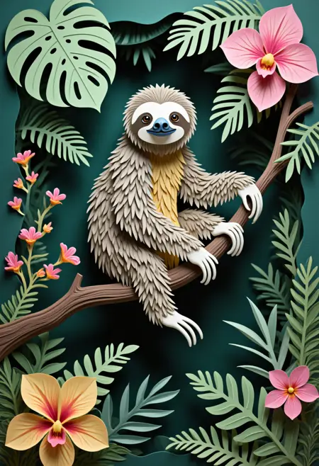 ジャングルをテーマにした紙切りスタイル、枝にだらしなくぶら下がるスローグ、周囲には大きなモンステラの葉と色鮮やかなランの花。