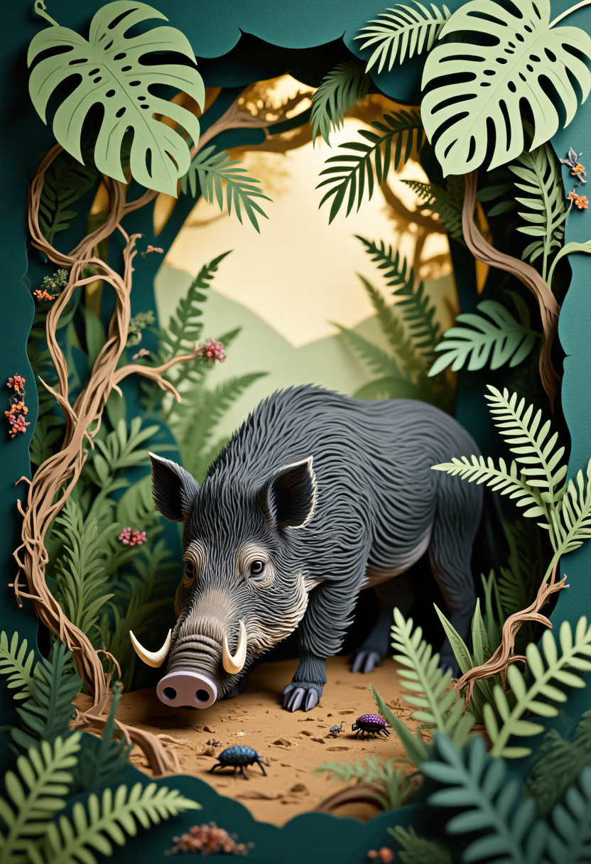 ジャングルをテーマにした紙切りスタイル、根元をほじくるイノシシ、周囲には落ち葉と小さな昆虫。