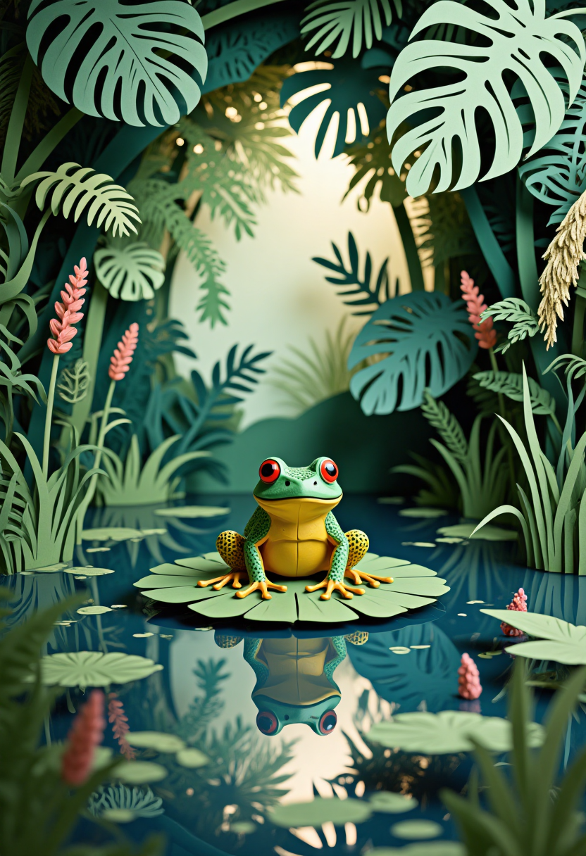 ジャングルをテーマにした紙切りスタイル、ジャングルの池の蓮の葉の上に座るカエル、周囲には葦とススキ。