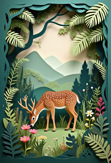ジャングルをテーマにした紙切りスタイル、開けた地で草を食むシカ、周囲には高い草や咲き誇る野の花。