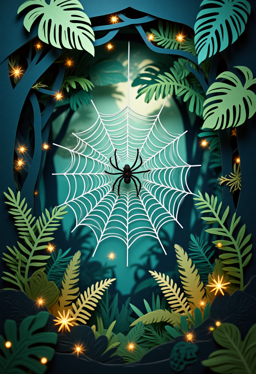 ジャングルをテーマにした紙切りスタイル、二本の木の間に張られたクモの巣、中央にクモがいて、その周りをホタルが飛び交う。