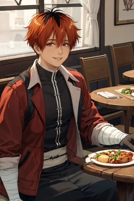 "红色夹克,黑色衬衫,白色腰带,黑色裤子,绷带,手套"