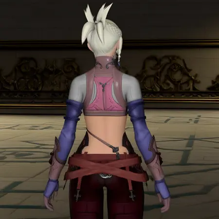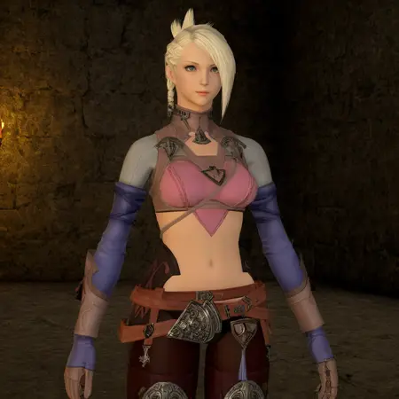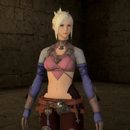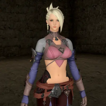 minfilia, hyur, bright blue eyes, medium breasts, antecedent armor, antecedent gloves, antecedent waist cape, jewelry, crop top, midriff