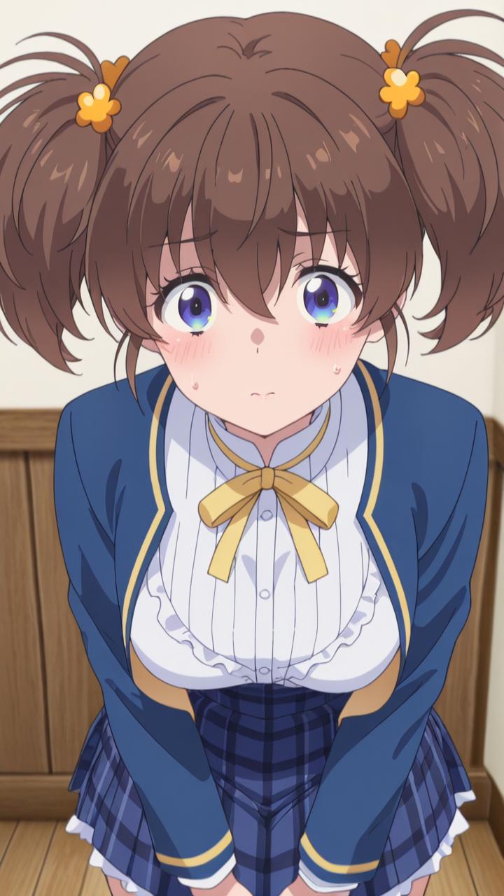 Dannoura, brown hair, short hair, twintails, hair between eyes, yellow hair ornament, blue eyes, medium breasts