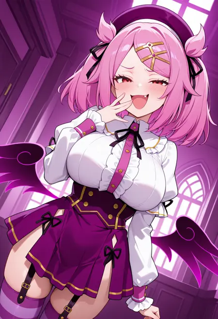 贝雷帽, 两侧高束, 带发根的双马尾, 发带, 紫色头饰, 白色衬衫, 中间荷叶边, 丝带, 层叠袖子, 蓬松袖子, 长袖, 高腰裙, 护胸, 紫色裙子, 侧开叉, 吊袜带, 紫色长筒袜, 条纹长筒袜, 紫色翅膀,