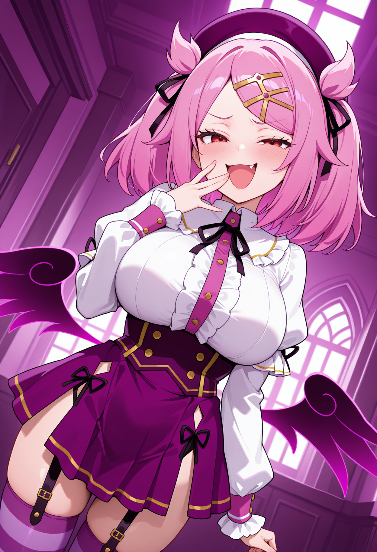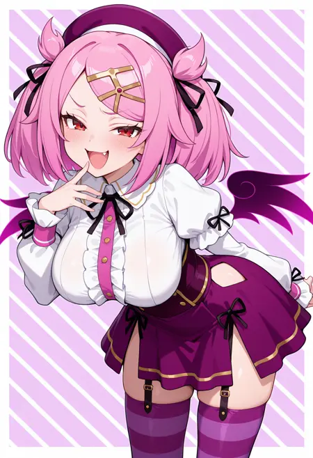 beret, two side up, twintails with hair base, hair ribbon, purple headwear, white shirt, center frills, ribbon, layered sleeves, puffy sleeves, long sleeves, high-waist skirt, corset, purple skirt, side cutout, garter straps, purple thighhighs, striped thighhighs, purple wings,