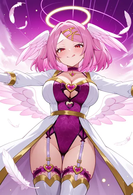 - angel, two side up, head wings, double halo, choker, lace-trimmed choker, collarbone, white dress, gold trim, open dress, two-sided fabric, white dress, long sleeves, gold trim, heart brooch, heart pendant, clothing cutout, jewelry, purple leotard, print leotard, heart cutout, garter straps, bridal garter, thigh boots,