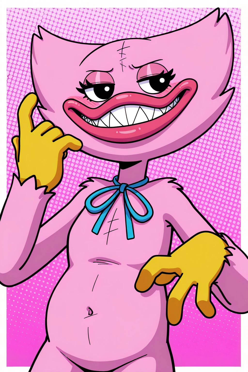 KissyMissyGT, 1girl, tall, living toy, pink fur, large black eyes, blue neck ribbon, yellow fingers, yellow feet, sharp teeth, pink lips, big lips, plump lips,
