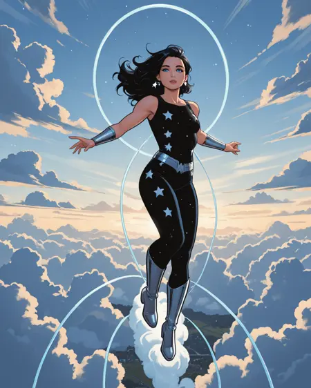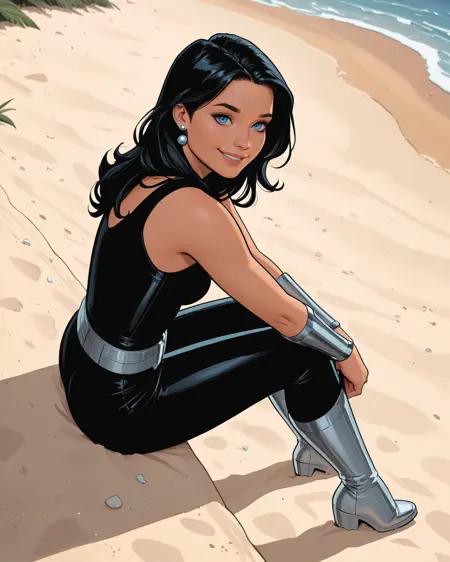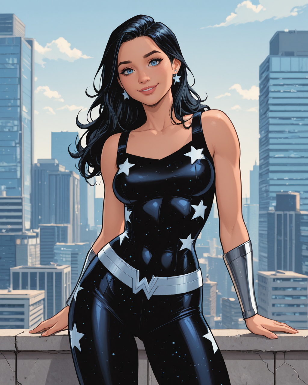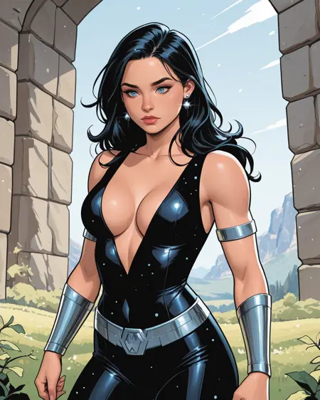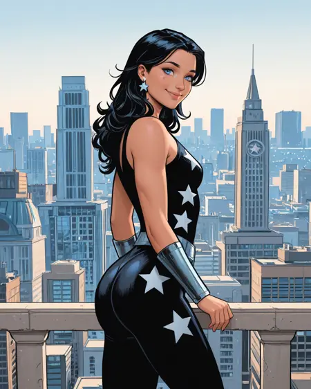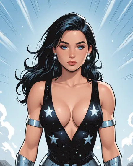 Triggers: donnatroywg, 1girl, black hair, blue eyes, earrings, bodysuit, belt, bracers, star (symbol)