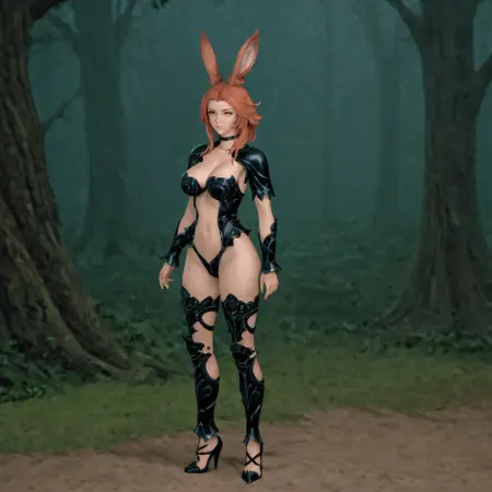 | 训练词汇 | viera, glowing eyes, yellow eyes, animal ears, short red hair, rabbit ears, revealing clothes, medium breasts, cleavage, black choker, black armor, black armored leotard, see-through,white stomach veil, navel, black short sleeves, black vambraces, black armored legwear, black high heels已复制! |