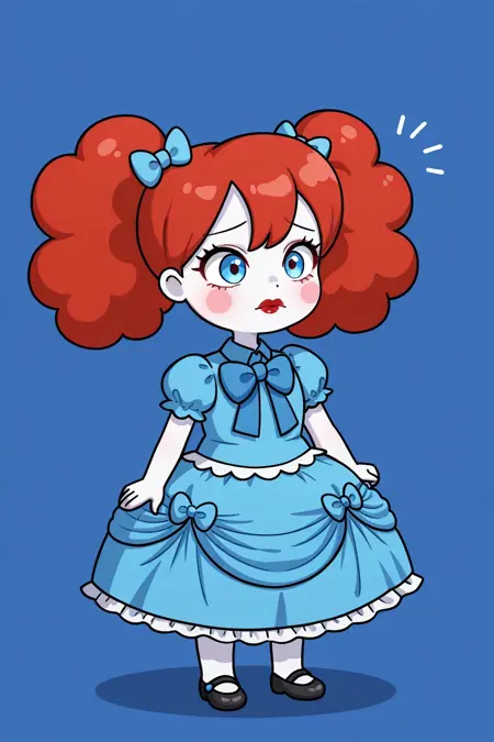 PoppyGT, 1girl, red hair in pigtails, large blue eyes, pale white skin, blush stickers, dark red lips, lipstick, plump lips, blue dress with a white frilly hem, big blue neck ribbon, black shoes, short, chibi,