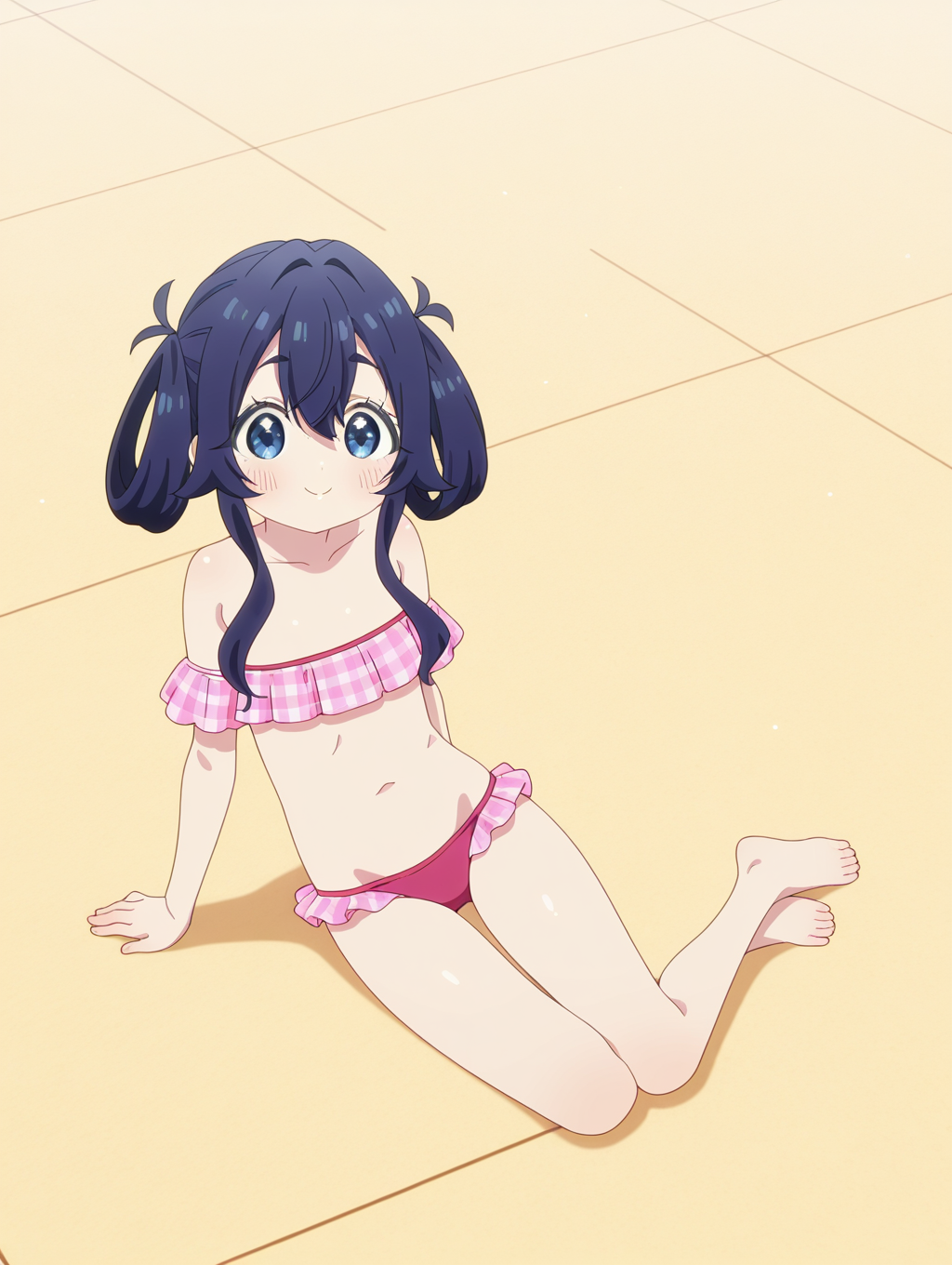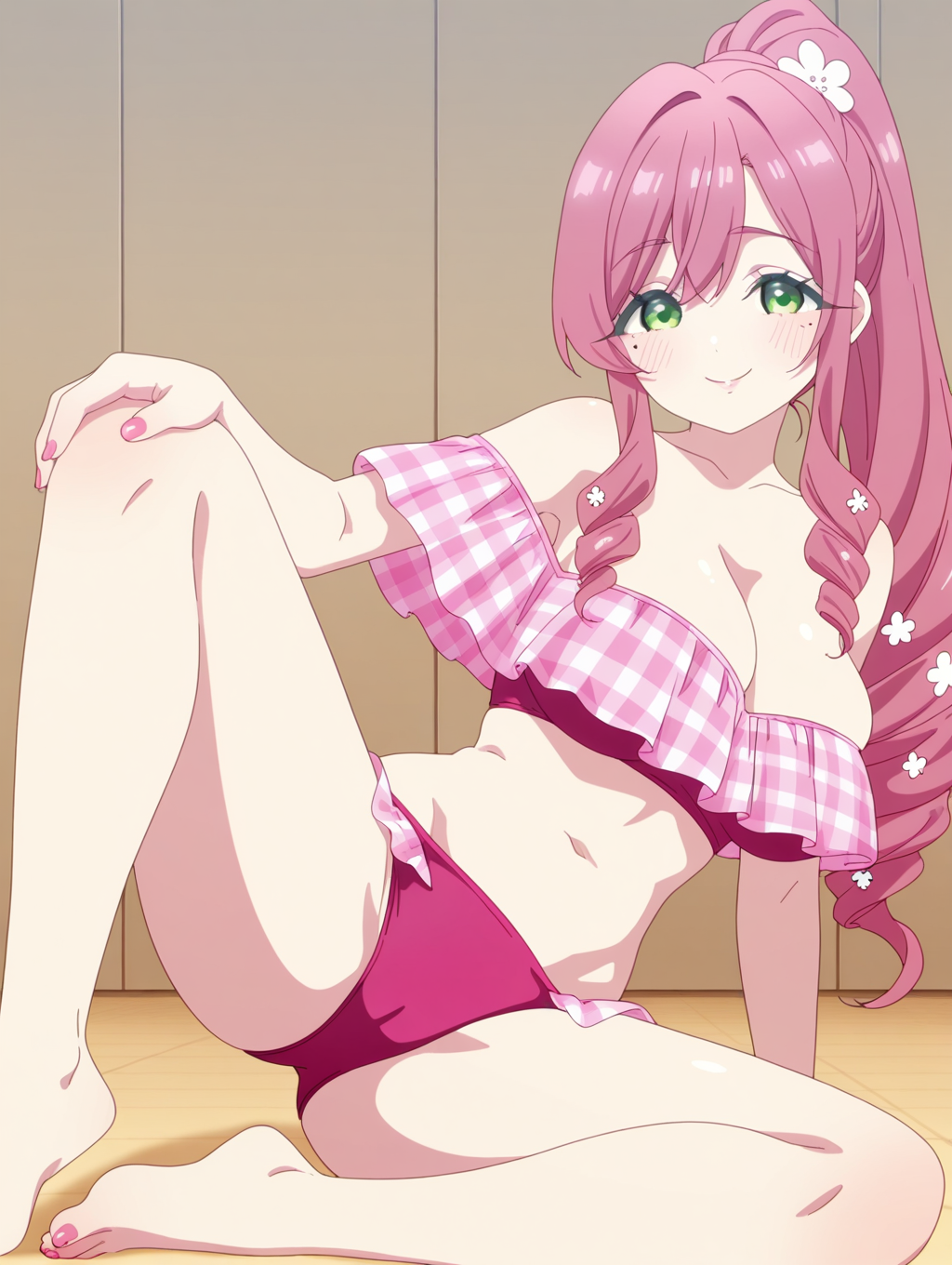 hakari 泳装(服装),泳装,粉色比基尼,比基尼,荷叶边比基尼,格纹比基尼上衣,露肩比基尼,赤足,