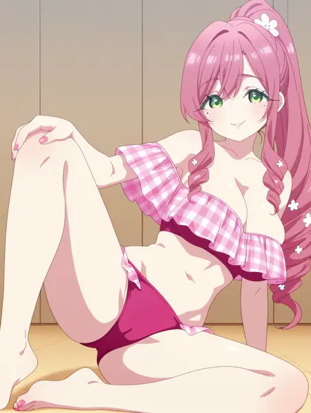 hahari hanazono(角色),粉发,长发,发饰,钻头状鬓发,大胸,发花,指甲油,粉指甲,绿眼,眼下痣,