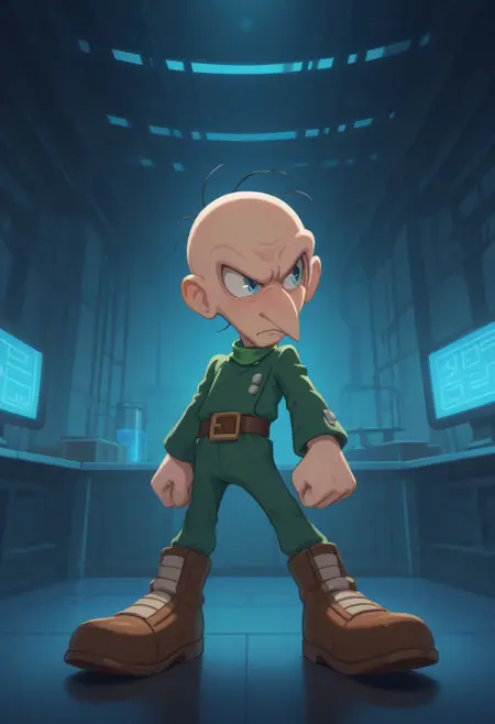 Snively, pale skin, pointy nose, bald, dark green coat, light green collar, light green pants, brown belt, brown shoes