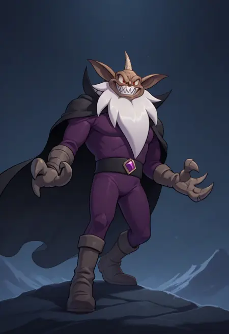 Ixis Naugus, brown skin, orange eyes, white beard, big brown ears, horn on top of head, sharp teeth, brown claw left hand, purple bodysuit, black sash, black cape, brown boots, holding silver staff with purple gem