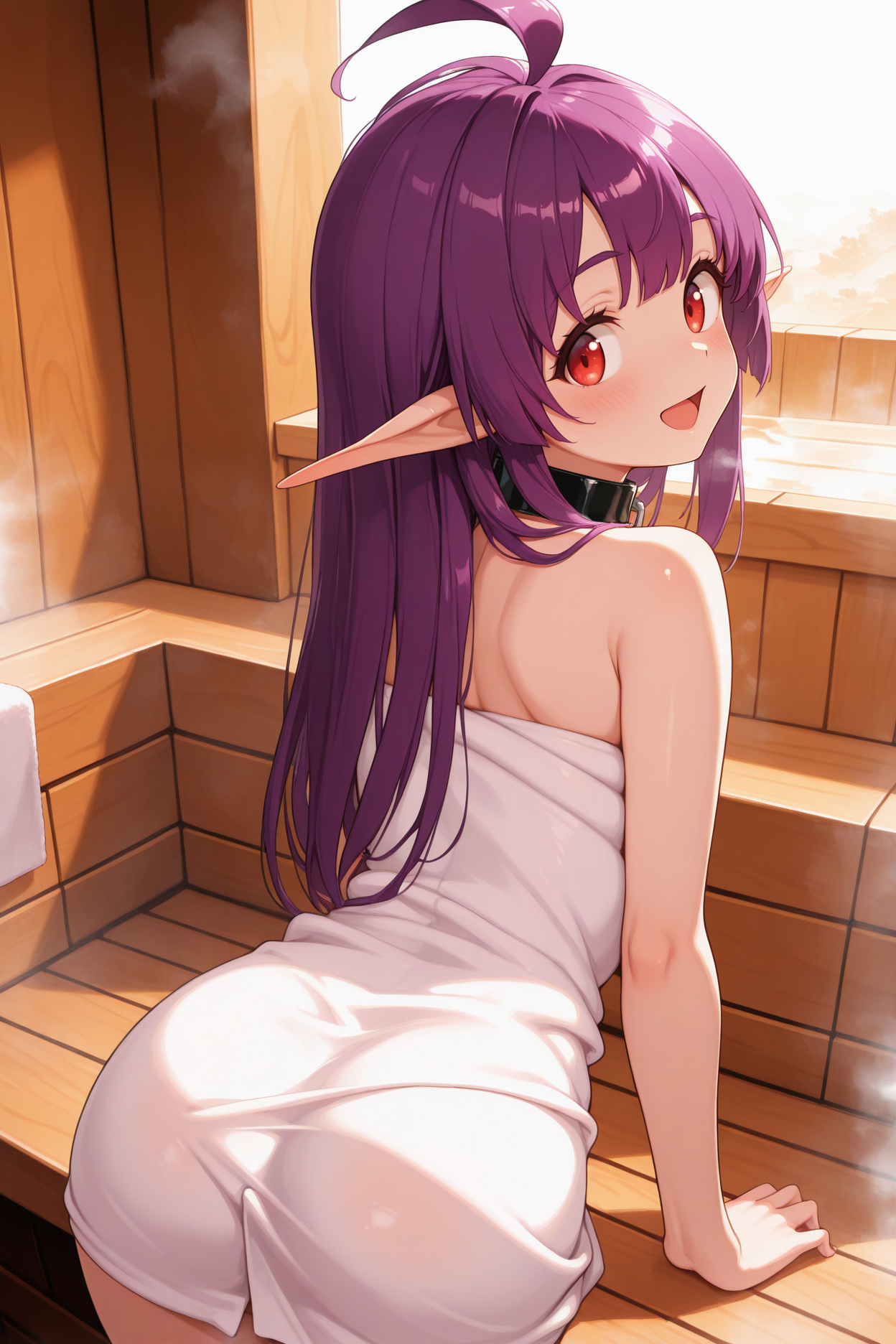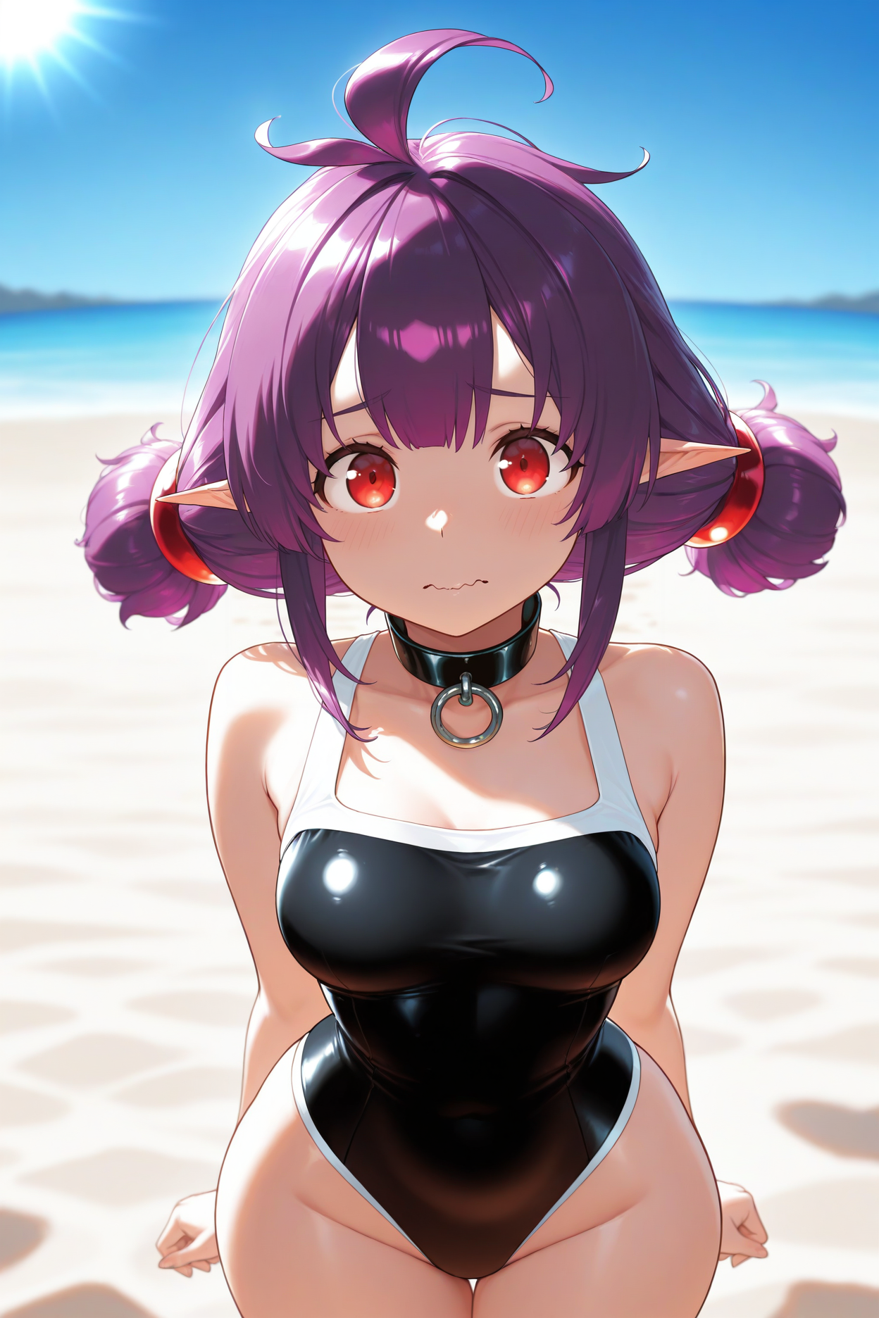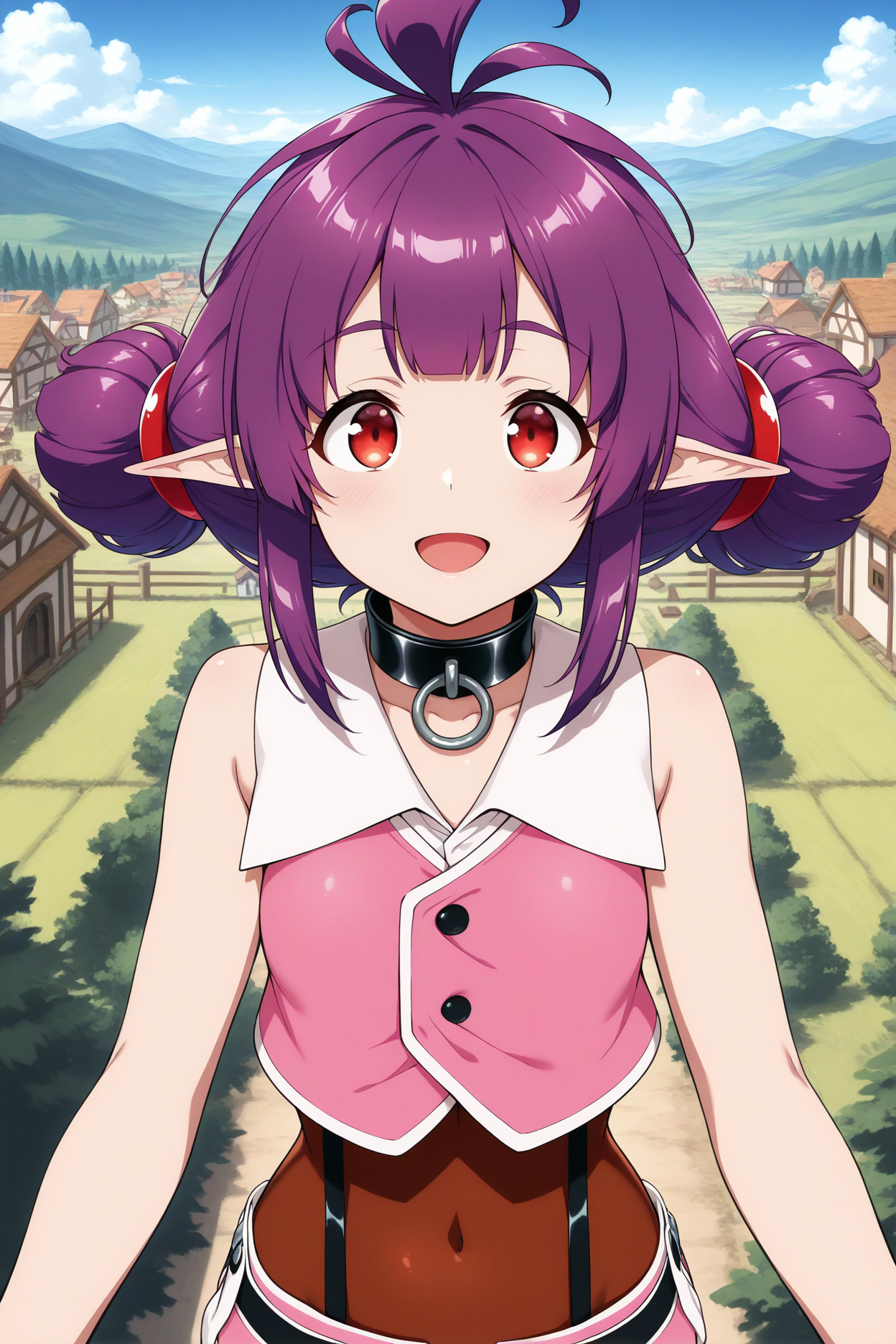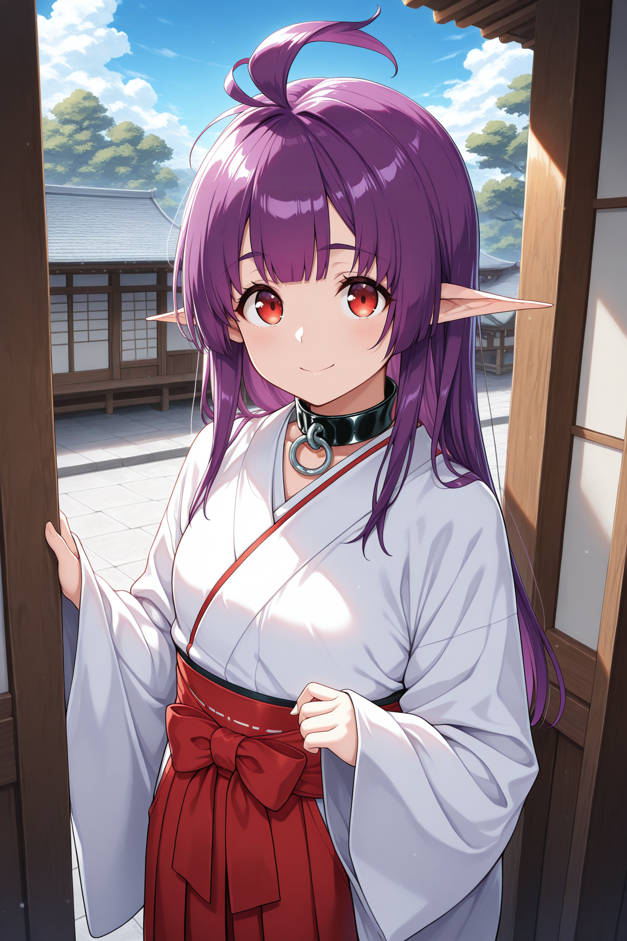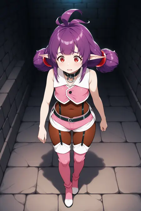 Trigger word is "shshr" and "purple hair, ahoge, red eyes, pointy ears, twintails" is required.